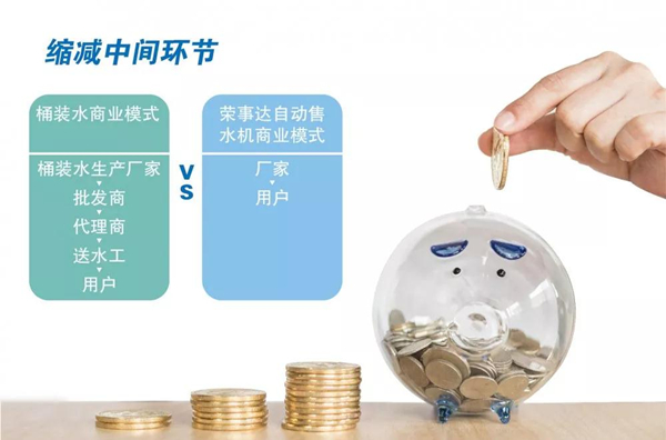 桶裝水的價(jià)格包含廠家生產(chǎn)成本、批發(fā)商差價(jià)、代理商差價(jià)、運(yùn)輸成本、送水工人力成本等諸多費(fèi)用,中間環(huán)節(jié)太多,最終還是有消費(fèi)者買單,而自動(dòng)售水機(jī)則是廠家直面用戶,大大縮減中間環(huán)節(jié),讓利于客戶,一桶水的價(jià)格相比市面上的品牌桶裝水價(jià)格要少50%以上,大大節(jié)省企業(yè)開支。