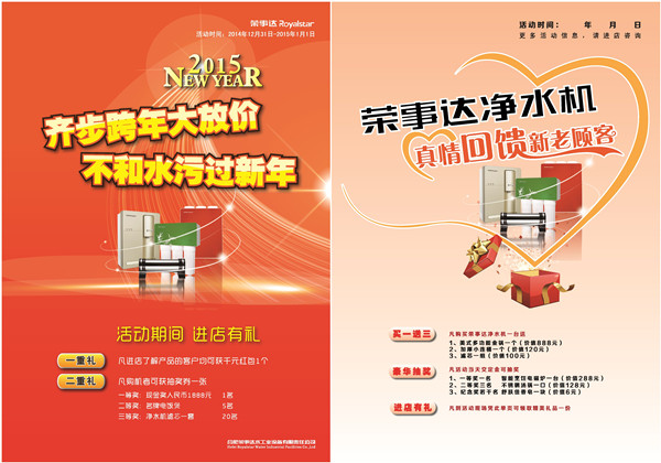 又至歲末,辭舊迎新,榮事達(dá)跨年獻(xiàn)禮,感恩回饋,再掀凈水狂潮。回首2014,居民飲水安全頻頻告急,安裝家用凈水機(jī)實(shí)現(xiàn)“純凈水自己造”,構(gòu)筑飲水安全最后一道防線,成為居民生活頭等大事。為普及凈水,元旦期間,榮事達(dá)將在全國多個省份推行惠民政策,加強(qiáng)推廣凈水機(jī)的力度。顧客在元旦期間進(jìn)店選購榮事達(dá)凈水機(jī),可獲得超值大禮。逛店拿紅包——顧客進(jìn)店咨詢產(chǎn)品信息,即可獲贈千元紅包;購機(jī)送好禮——購買榮事達(dá)純水機(jī),可獲贈管線機(jī)、凈洗機(jī)等精美大禮;歡樂抽大獎——顧客現(xiàn)場購機(jī)可參加抽獎活動,現(xiàn)金大獎、名牌家電、濾芯套裝等各項大獎送不停。開心跨年,悅享凈水。新的一年,榮事達(dá)凈水機(jī)將以更優(yōu)質(zhì)的產(chǎn)品、更好的服務(wù)加速凈水普及,真正讓惠于民,讓廣大消費(fèi)者喝上安全、健康的好水,提高居民生活品質(zhì)。- [關(guān)閉] [打印]