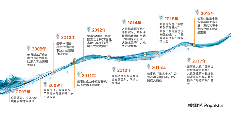 2018年5月,榮事達正式發(fā)布十大水處理系統(tǒng)發(fā)展藍圖,全面布局全屋智慧凈水、校園直飲水、城市公共飲水、社區(qū)智慧飲水、農(nóng)村安全飲水、工業(yè)污水處理、生活污水處理、景觀水處理、醫(yī)療用水處理、海水淡化十大領域。