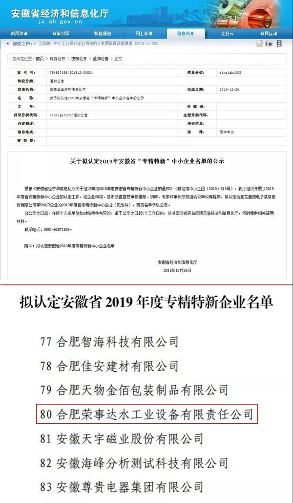 •        12月26日,安徽省經濟和信息化廳公布了2019年安徽省“專精特新”企業名單,合肥榮事達水工業設備有限責任公司憑借在專業化、精細化、特色化和創新化方面的獨特優勢成功入選。