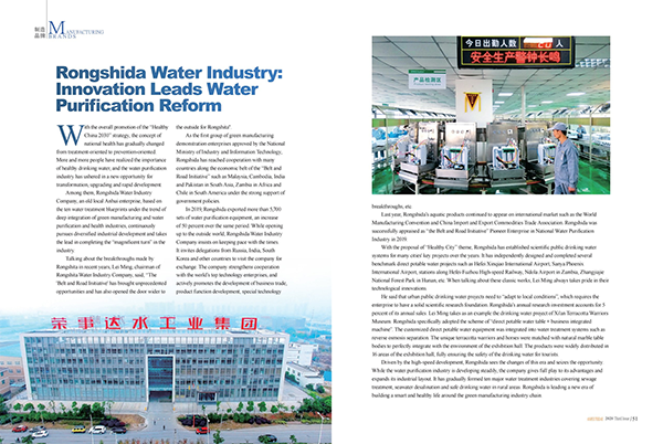 談起近年來榮事達所取得的突破,榮事達水工業(yè)公司董事長雷鳴表示:“‘一帶一路’戰(zhàn)略帶來了前所未有的機遇,也為榮事達打開了更廣闊的海外大門”。作為國家工信部首批綠色制造示范企業(yè),榮事達在政府政策大力支持下,與東南亞馬來西亞、柬埔寨,南亞印度、巴基斯坦,非洲贊比亞,南美洲智利等“一帶一路”經(jīng)濟帶上多國達成合作。2019年,榮事達凈水設備貿(mào)易出口逾5700臺,同期增幅達50%。 而在對外開拓的同時,榮事達水工業(yè)公司堅持與時俱進,邀請俄羅斯、印度、韓國等各國考察團走進公司參觀交流,并與全球頂尖技術企業(yè)加強合作,積極促成商務貿(mào)易、產(chǎn)品功能開發(fā)、專項技術突破等發(fā)展。去年,榮事達水工業(yè)產(chǎn)品持續(xù)亮相世界制造業(yè)大會、中國進出口商品貿(mào)易會等國際舞臺。憑借企業(yè)在外貿(mào)領域的突出引導性,2019年榮事達成功獲評“全國凈水行業(yè)一帶一路先鋒企業(yè)”,贏得行業(yè)一致肯定。