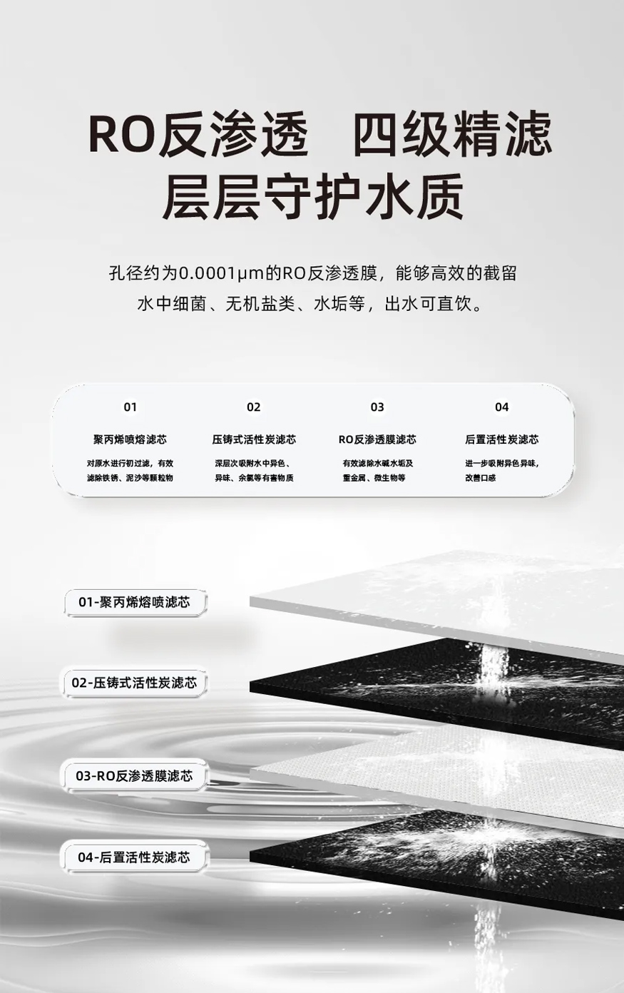 好凈水機的核心是“濾得干凈,用得省心”。新品四級精濾系統為自來水設四道關卡:第一道聚丙烯熔噴濾芯篩除鐵銹、泥沙,讓水變清;第二道壓鑄式活性炭吸附怪味和余氯,告別燒水異味;第三道RO反滲透膜(0.0001μm孔徑)攔截重金屬、微生物、水垢,過濾后可直飲且清甜;最后后置活性炭調口感,讓泡茶更香、煲湯更入味。