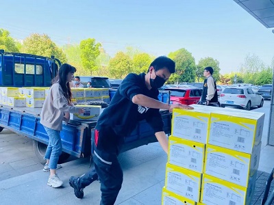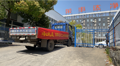 4月8日榮事達水工業(yè)集團工作人員以最快的速度進行物資的裝載,滿載著抗疫物資,發(fā)往37℃的愛活動統(tǒng)籌處。