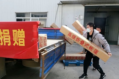 榮事達水工業(yè)集團在得知消息后,第一時間聯(lián)系到主辦單位,向堅守在抗疫一線的工作人員送去滿載的蘇打水和帳篷,為奮戰(zhàn)在抗疫一線的工作人員提供后勤保障。