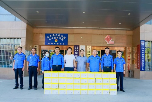 8月12日上午,榮事達(dá)水工業(yè)集團(tuán)為雙鳳城市管理行政執(zhí)法中隊(duì)送去一批蘇打水,向堅(jiān)守在城市管理一線的工作者們表達(dá)敬意。